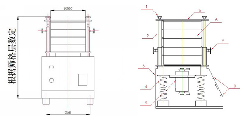 1、圓手柄2、立桿3、殼體4、彈簧5、蓋板6、篩具7、緊定手柄8、指示面板9、振動(dòng)電機(jī)