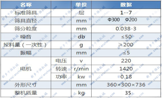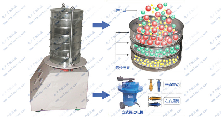 采用新式振動(dòng)電機(jī)產(chǎn)生水平、垂直、傾斜的三次元振動(dòng),再把這種振動(dòng)傳遞給標(biāo)準(zhǔn)分析篩具及物料面從而優(yōu)良分級(jí)。